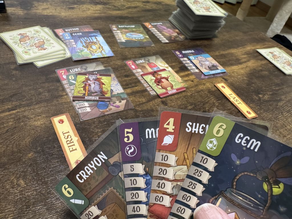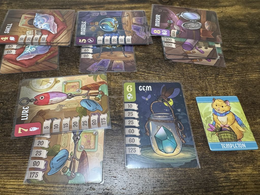 ・小動物たちが小さな宝物を集めて巣穴を飾る、入札+ドラフト+セットコレクションのゲームです。