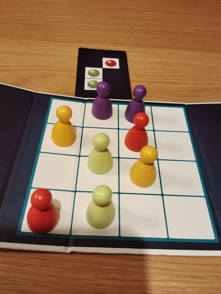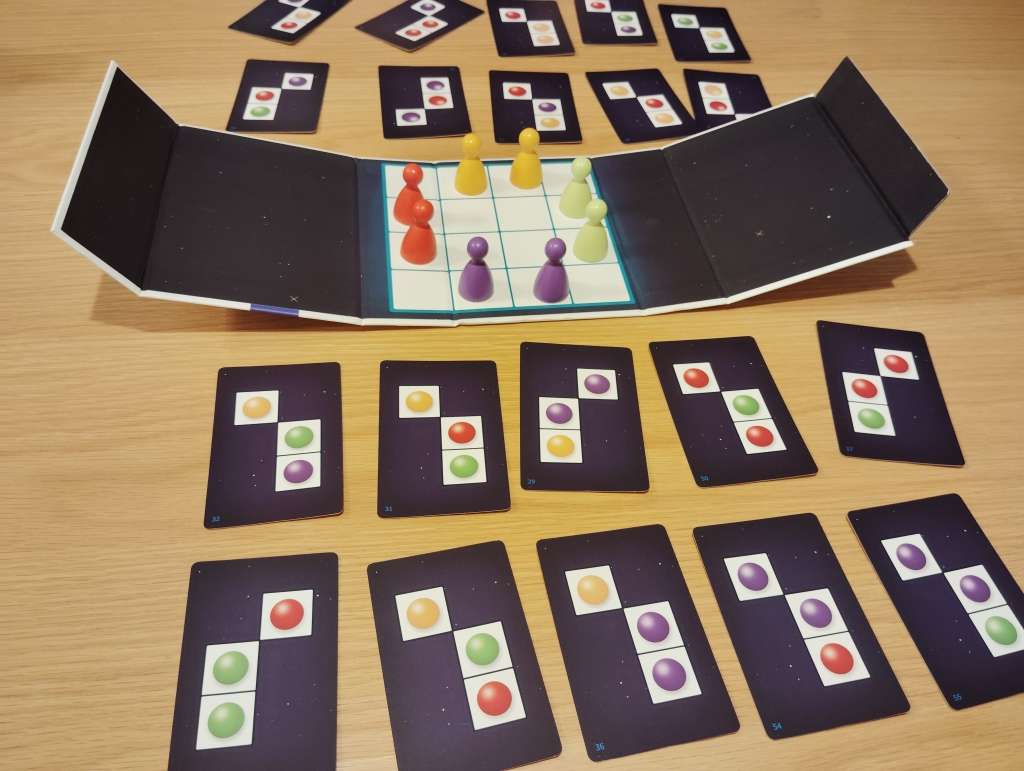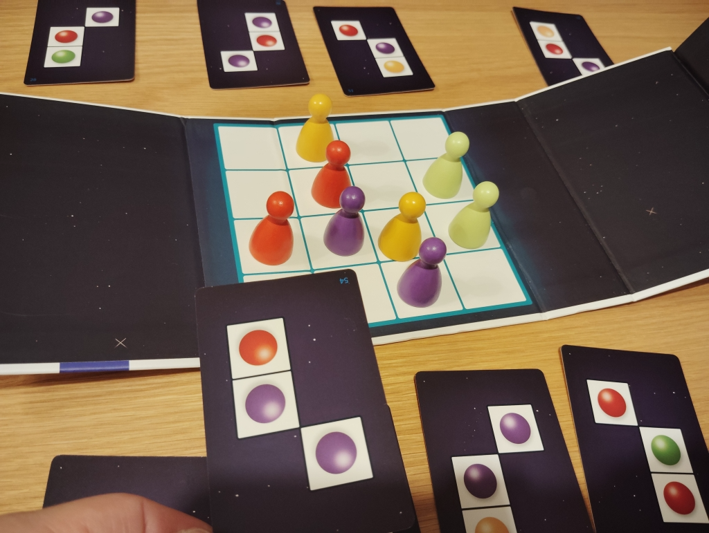 コマを1個動かして、指示通りにコマが配置されていたらカードを捨てていき、先にすべてのカードを無くしたら勝ち(バリアントルール)。