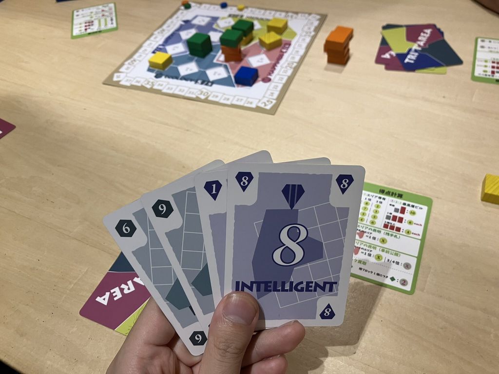 カードを出して最大と最小の人が勝つという変則的な勝負をした後、勝ったプレイヤーは任意のマスにブロックを置きます。