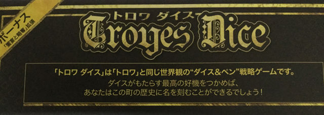 それはともかくトロワファンはずっとマチカネタンホイザだった(わかりにくいダジャレ)トロワ・ダイス。まさかの日本語版です。何がすごいって、日本語ロゴがわかりにくいところに隠してある! お前はサイゼのエクストリーム間違い探しか! なおホビージャパンのロゴも表面にないため、契約上の関係だと思われます。