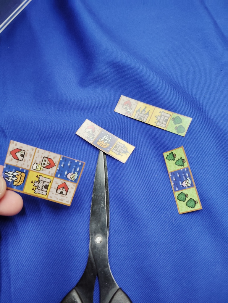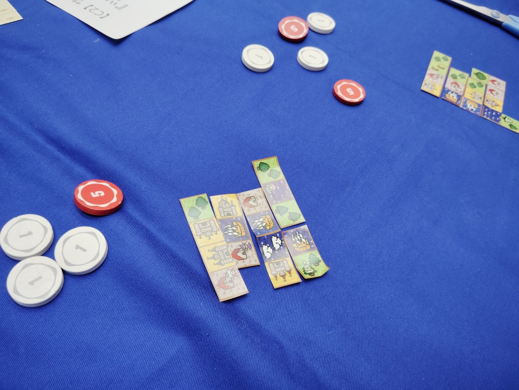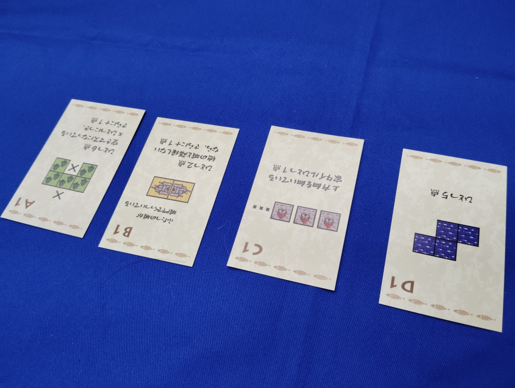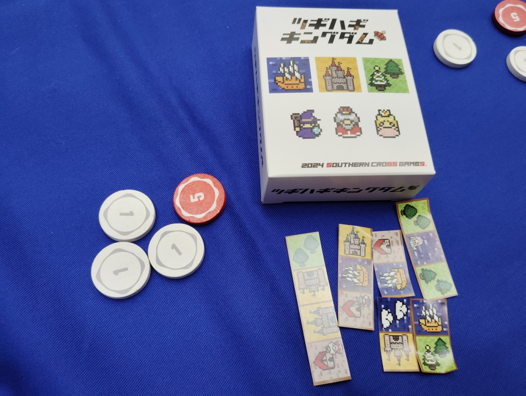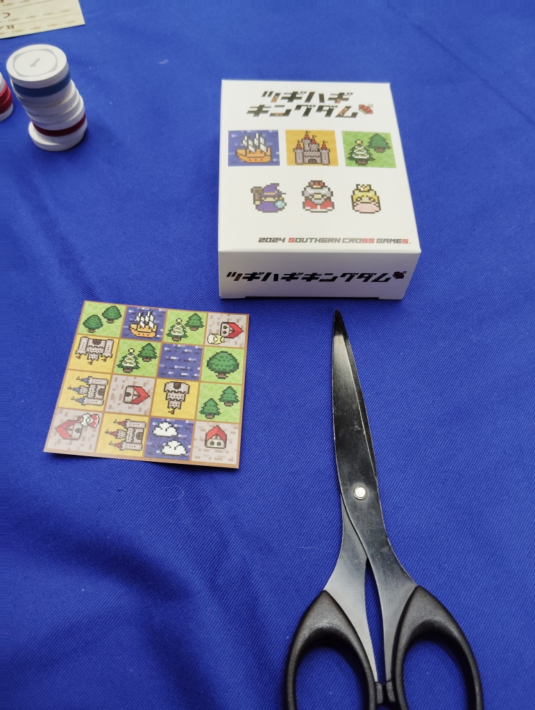 『ツギハギキングダム』は、4×4のシートをみんなで縦列に切っていき、渡し合っていくドラフトシート配置ゲーム。