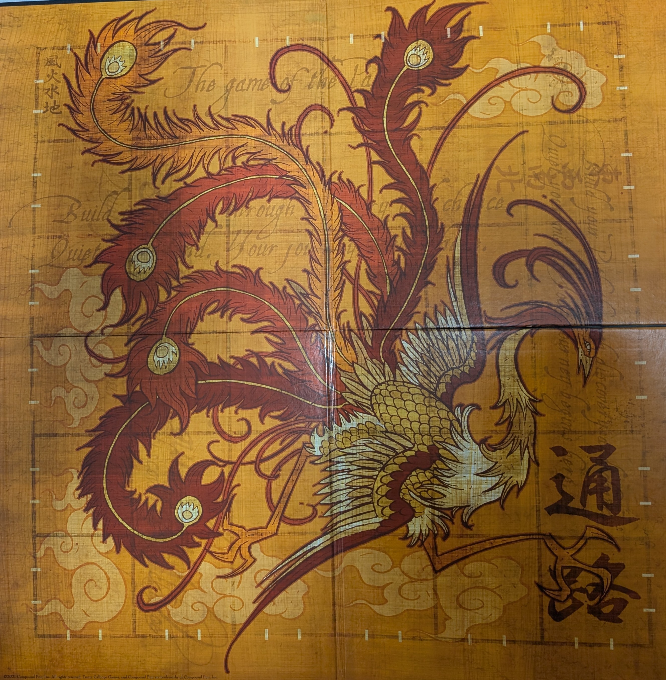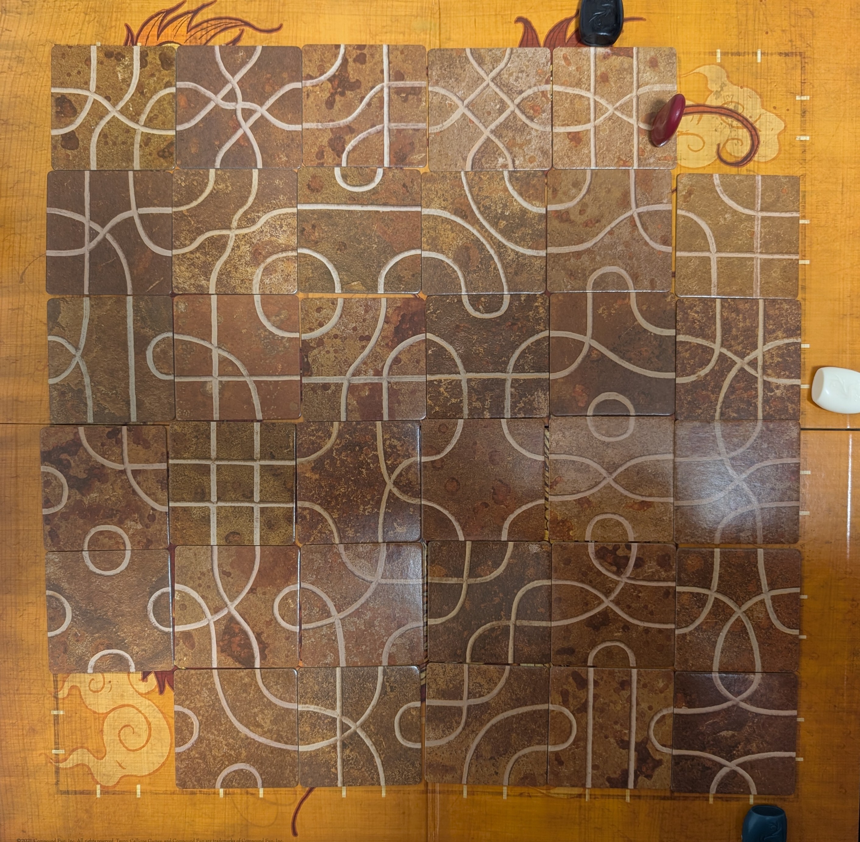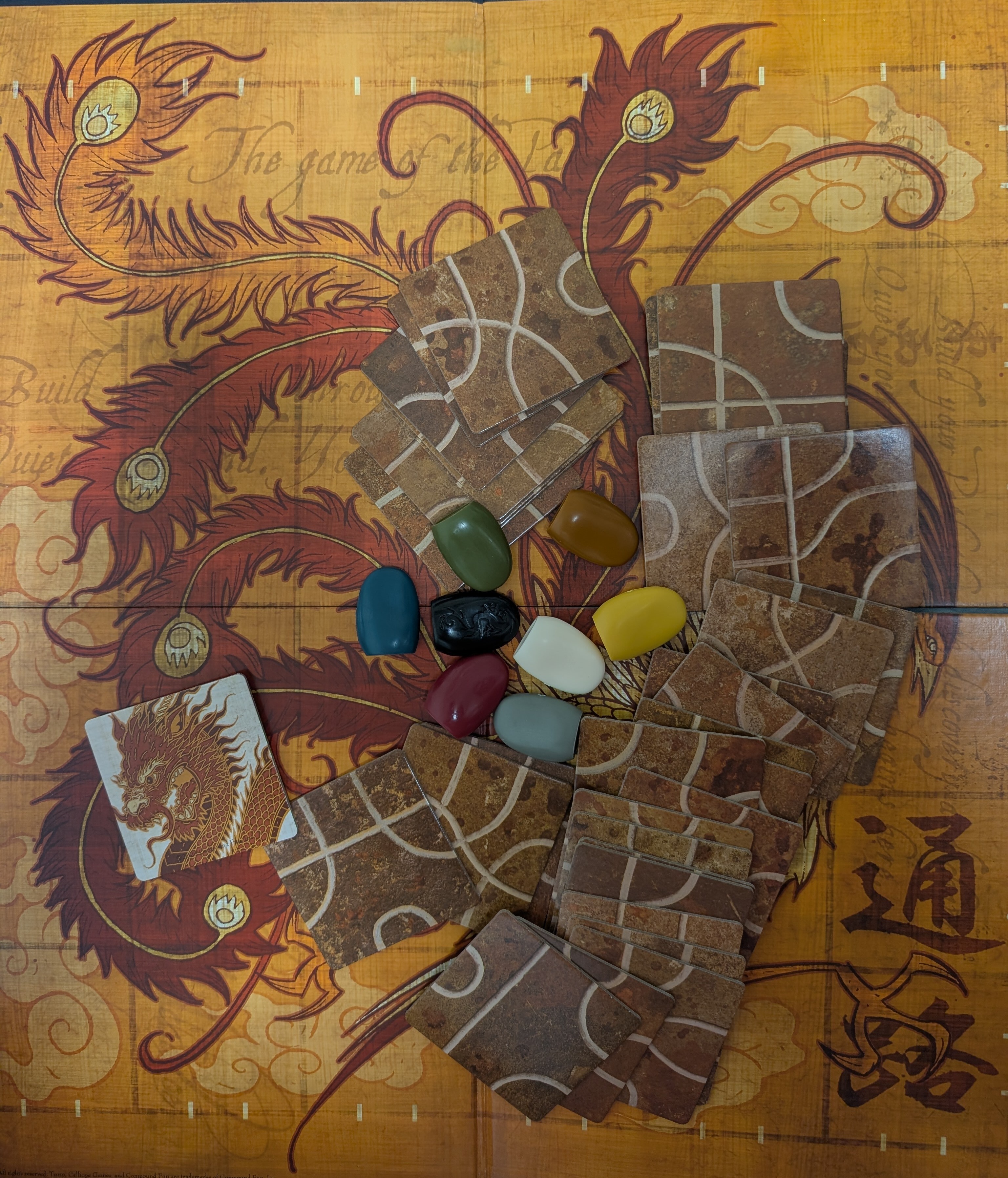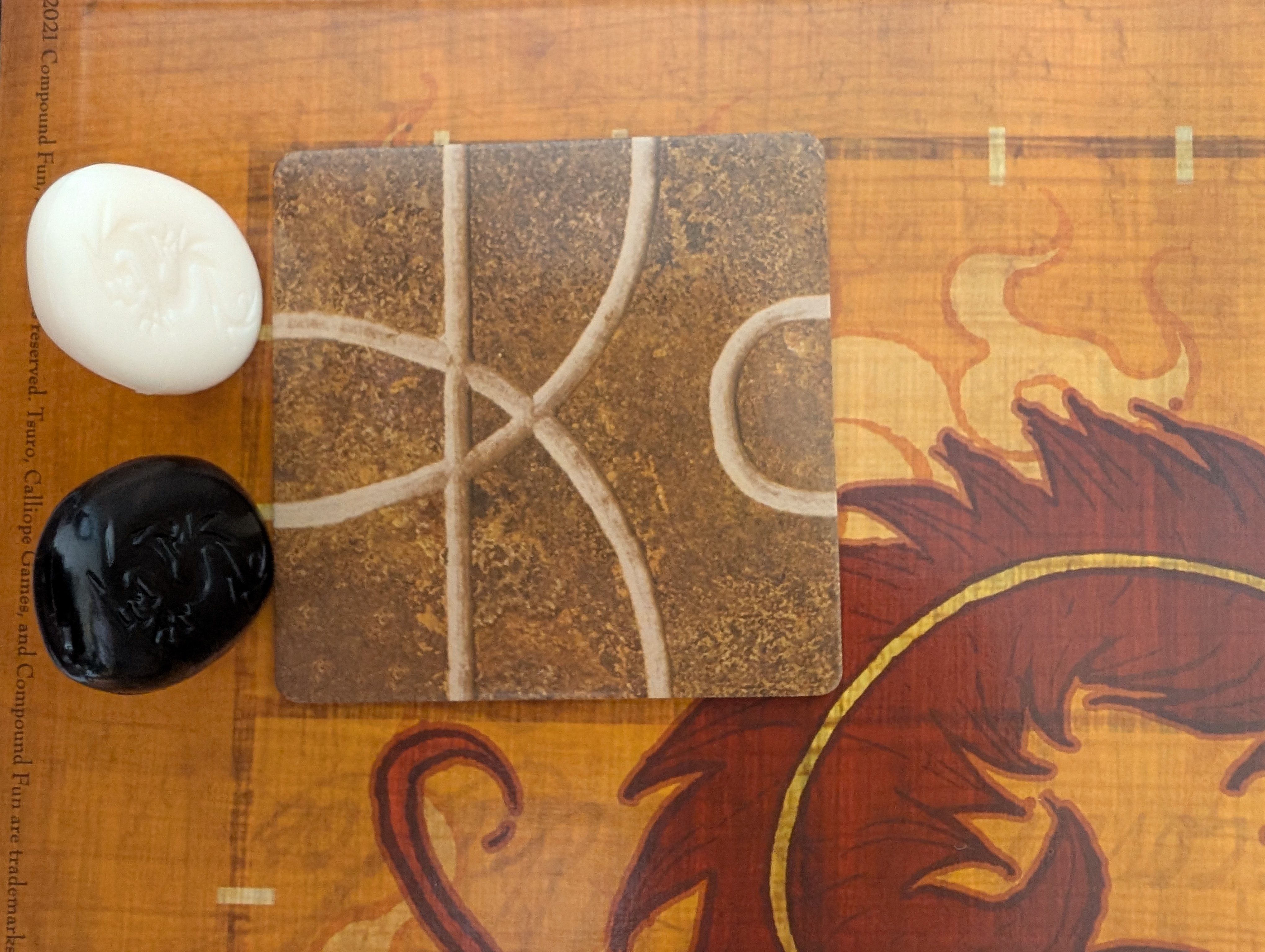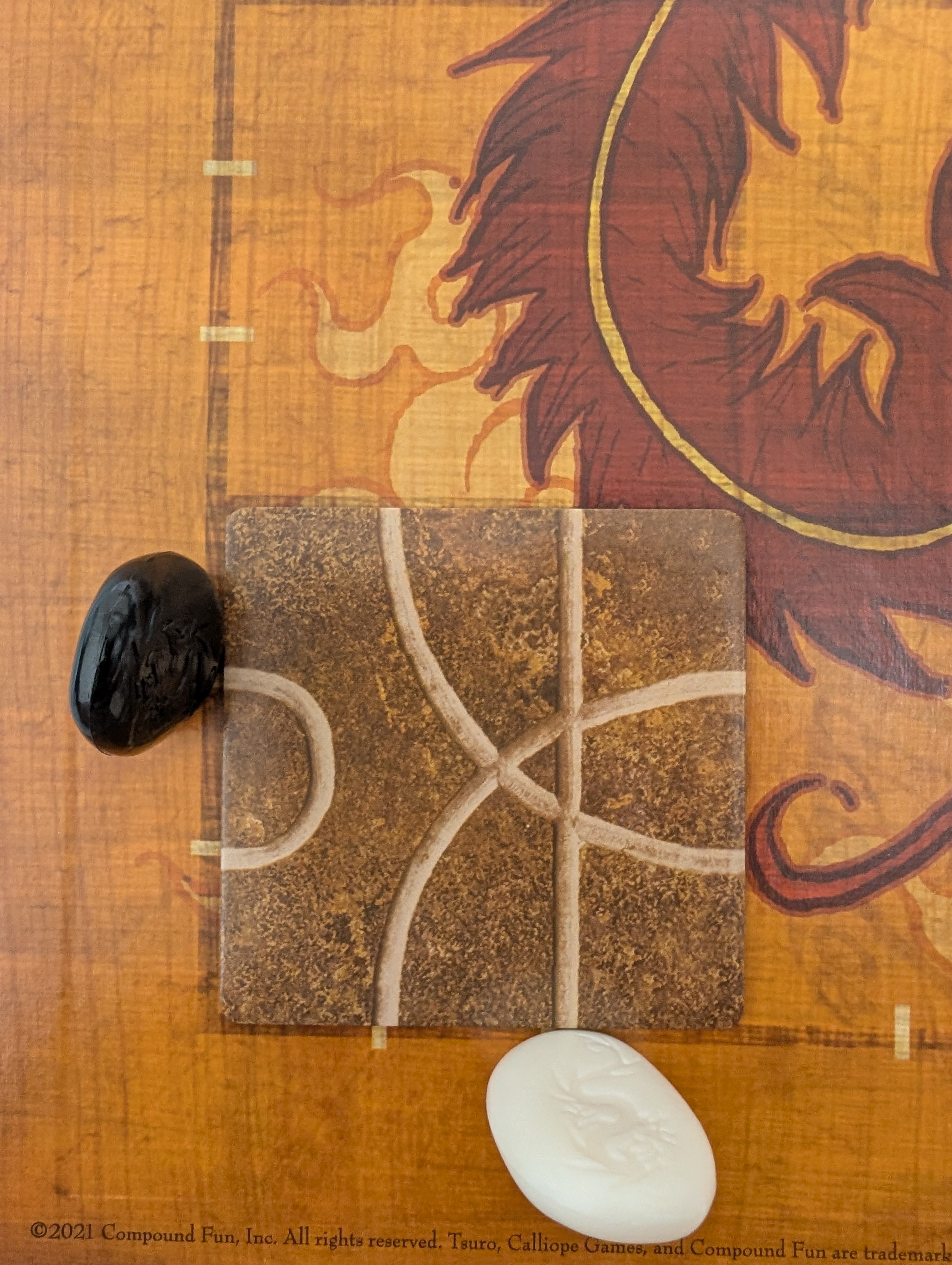 龍の描かれたごつい箱。中を開けると大きいボードと様々な線が引かれた大きいタイル、そして謎の石が八つ。知らない人は「これは難しそうだぞ」と身構えるに十分な面構えをした作品です。