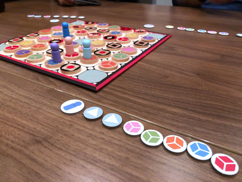 桂馬の動きをするコマを動かして中央のゴールに行くと勝ちなんだけど、それまでに指定された順番で色マスを踏んでいかないといけない。