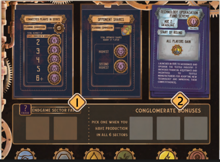 3. 計画委員会カードAデッキとBデッキを別々にシャッフルします。計画委員会カード「A」を1枚、Bを2枚取ります。3枚のカードをセクタートラックボードのスロットに表向きに置きます。