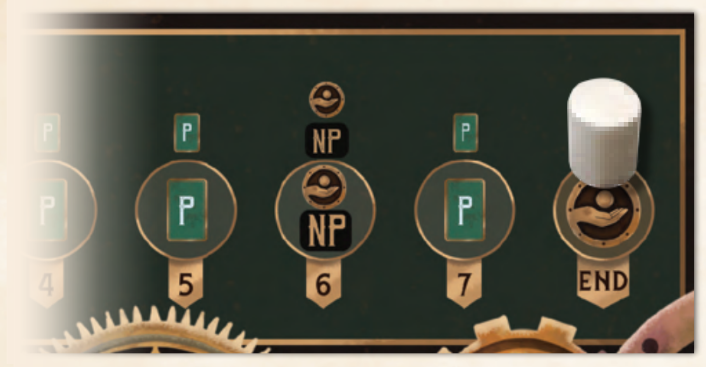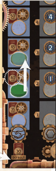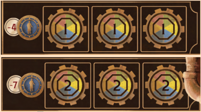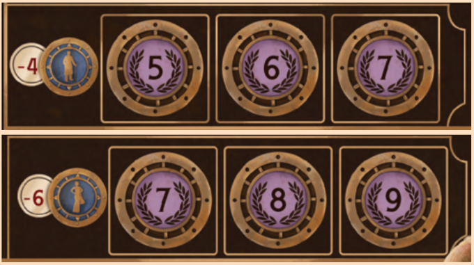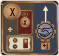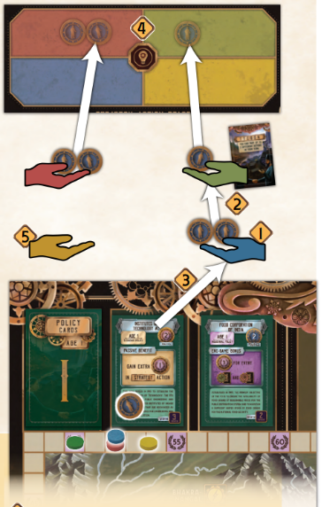 13. 手番順の最後尾プレイヤーから反時計回り(プレイヤーの逆順)に、各プレイヤーは影響力トラックの1、2、3、または4のマスに自分のプレイヤーディスクを置きます。これがゲーム開始時の初期影響力となります。開始時に4つの選択肢のうち、1つのマスに置けるディスクは1枚のみです。