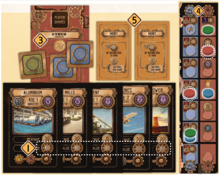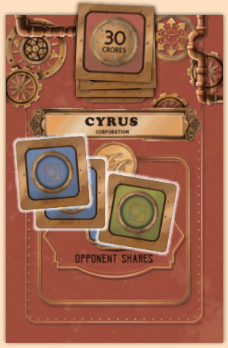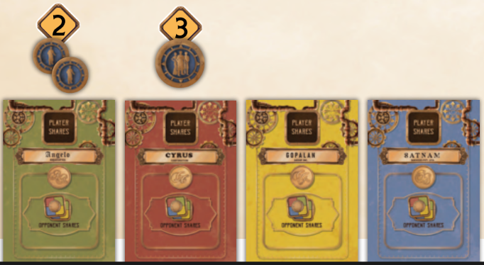 10. 各プレイヤーに、プレイヤーカード1枚、プレイヤースクリーン1枚、木製ディスク8枚、木製工場9個、価値30~70の株式トークン9枚(すべてプレイヤーの色の同じ)、そしてリファレンスシートを配り、個人サプライを形成します。株式トークンはプレイヤーカードに昇順で積み重ねられ、各プレイヤーの株式価値はそれぞれ上が「30」、下が「70」となります。