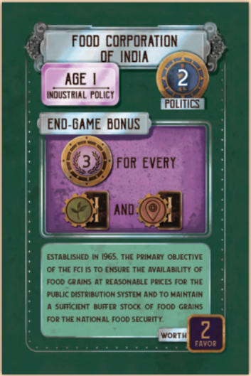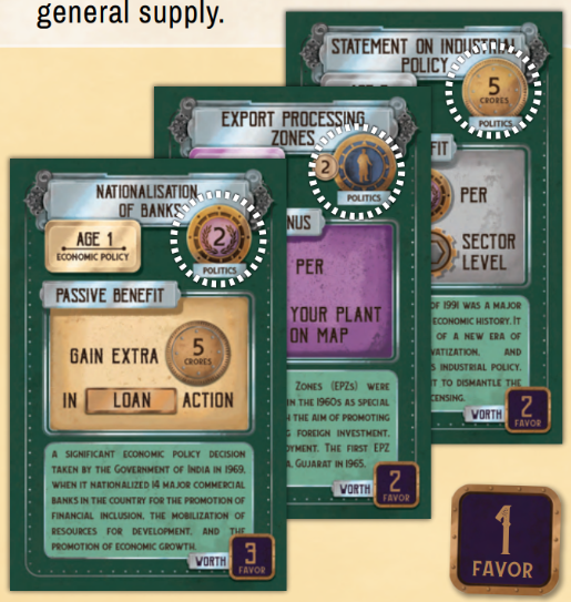 16. 政策カードデッキから、プレイヤー数と同じ数の政策カードを引きます。再びプレイヤーの逆順で、各プレイヤーは利用可能な政策カードを1枚無料で選び、自分のプレイエリアの近くに置き、初期政策とします。プレイヤーの政策カードは、ゲーム中常に公開されます。