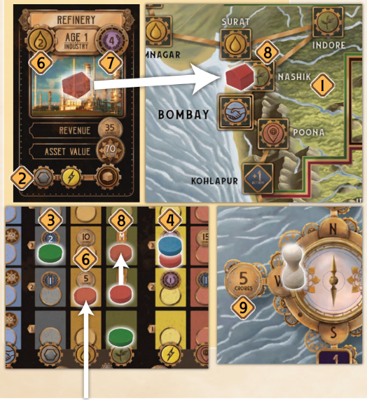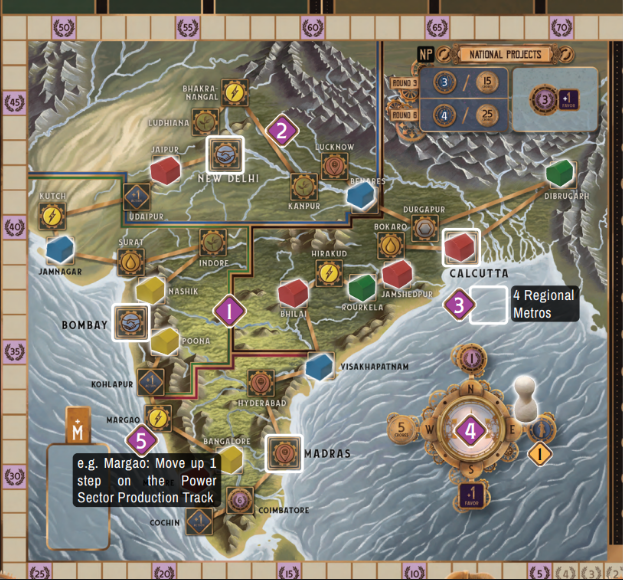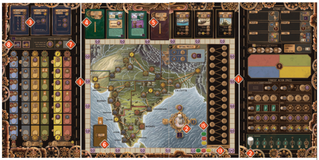 あなたは、インドにおける改革の新たな時代の幕開けを告げる新進気鋭の実業家です。この国で最大の産業帝国を築くという使命を帯びています。7ラウンドにわたるゲームを通して、ライバル企業と競い合い、独占的な産業権を獲得し、主要政策を獲得してボーナスを獲得し、インドの主要都市に工場を建設し、融資(時には緊急融資も!)を受け、プロモーターを集めて戦略的優位性を獲得し、他のプレイヤーの株式に投資し、国家プロジェクトに貢献し、政治的優位性を獲得しながら、国家再建を進めなければなりません。