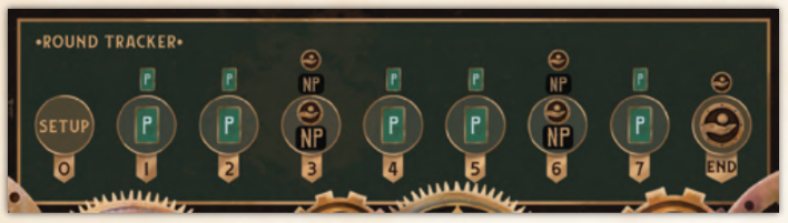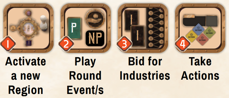 全てのプレイヤーが(必要に応じて手番順に)1つのフェイズを解決し、その後次のフェイズへと進みます。これを繰り返します。4つ目のフェイズ(アクションの実行)が解決されると1ラウンドが終了し、ラウンドマーカーは次のラウンドに移動し、新しいラウンドはフェイズ1(新たな地域の活性化)から始まります。