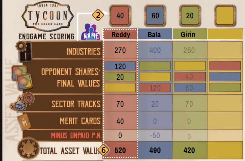 資産価値はプレイヤーの総資産を表し、ゲームに勝利するための2つの主要な方法のうちの1つです。資産価値は、産業の建設、適切なプレイヤーの株式の購入、金融・輸送トラックの昇格、そして資産価値をもたらす功績カードの保有によって得られます。