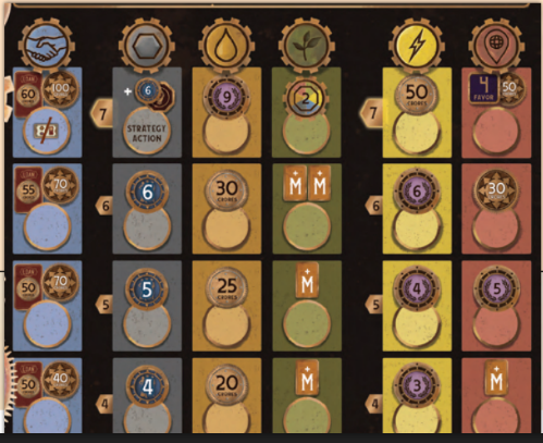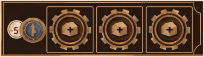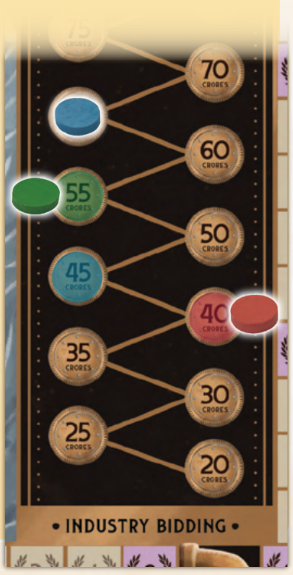 15. 各プレイヤーは、さらにプレイヤーディスクを産業入札トラックの近くに置きます。残りの6枚のプレイヤーディスクは、後で6つの産業セクターレベルを追跡するために使用します。