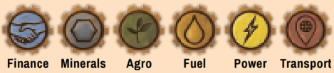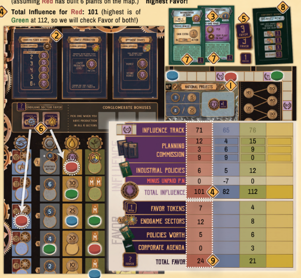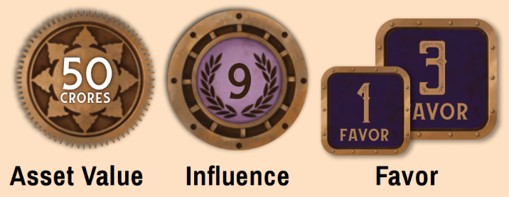 ゲーム中、資産価値は産業カードまたはボード上の特定のエリアの値を通じて間接的に追跡されます。ゲーム内の影響力は、マップボードの周囲を回る影響力トラッカーで追跡されます。支持は、プレイヤーが所持する支持トークンを通じて追跡されます。