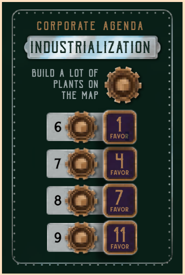 17. 企業アジェンダカード8枚すべてをシャッフルします。各プレイヤーは企業アジェンダカードを2枚引き、秘密裏に確認し、1枚を選びます。もう1枚は箱に捨てます。これがゲームで選択した課題となります。企業アジェンダカードは、所有するプレイヤーがいつでも確認できますが、対戦相手には見せてはいけません。