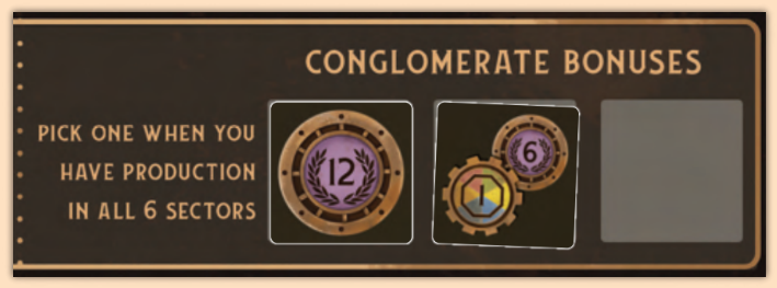 7. 複合企業ボーナストークン6枚をシャッフルし、3人プレイの場合は2枚、4人プレイの場合は3枚を選び、セクタートラックボードの指定エリアに表向きに置きます。