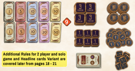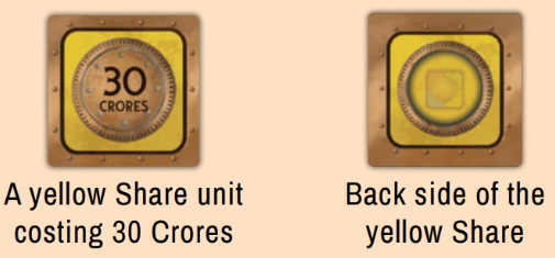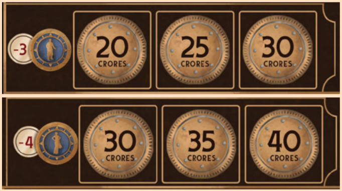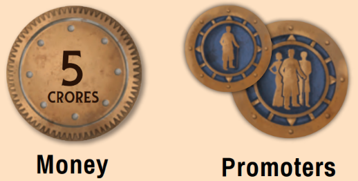 12. 各プレイヤーは、合計150Cr(クローレ)の初期資金トークンを受け取ります。ただし、タイクーンのプレイヤーは金130Crを受け取ります。