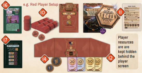 11. スタートプレイヤーをランダムに決定します。そのプレイヤーは、タイクーンプレイヤーマーカーとタイクーンアクショントークンを受け取り、そのラウンドのターン順で最初のプレイヤーとなります。(ターン順は常にタイクーンから始まり、時計回りに進みます。)
