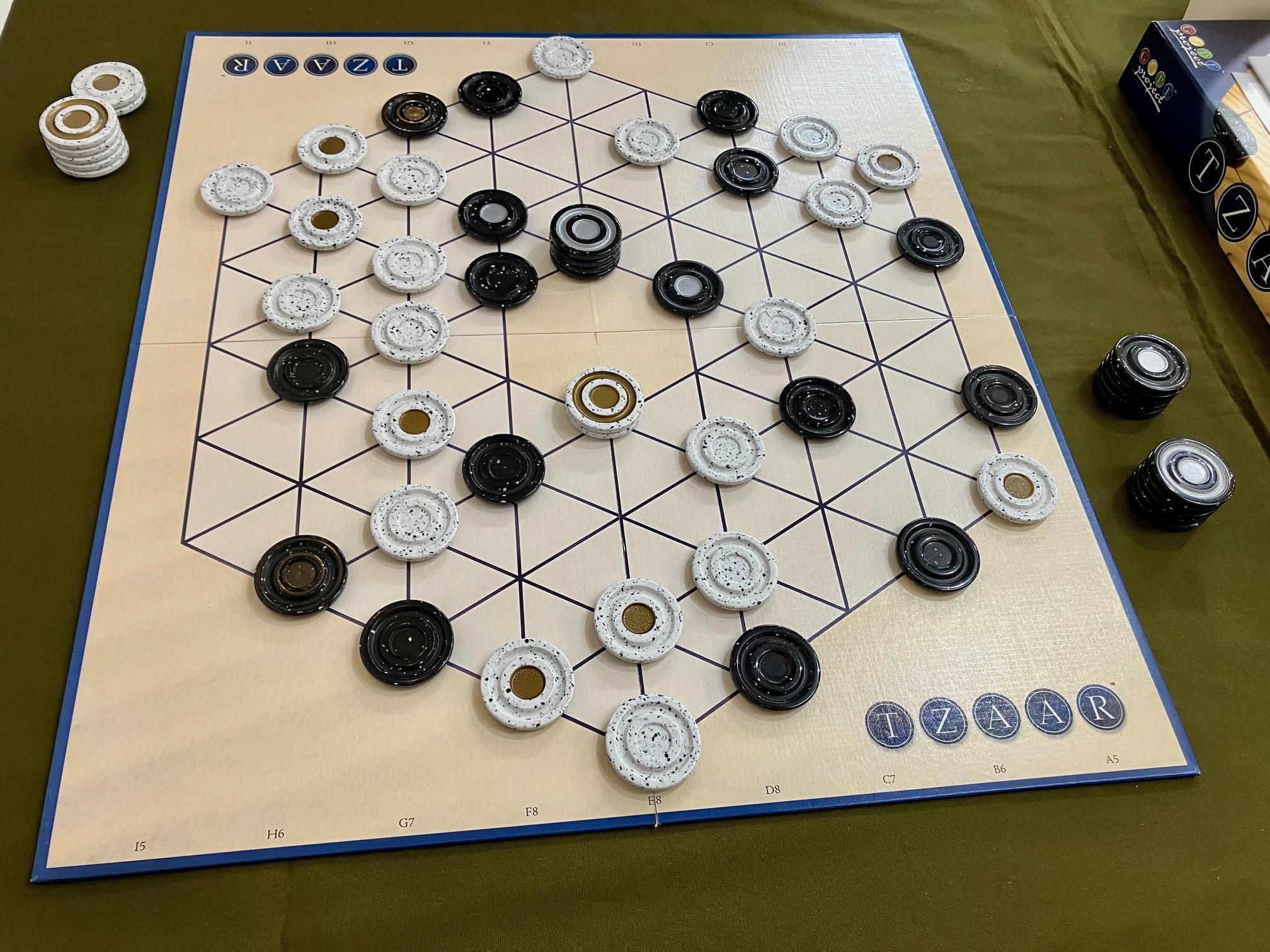 GIPFシリーズ。なかなか他には無いルールで戸惑うが、慣れてくると作者の意図がわかり感心する。序盤~中盤での狙いと、中盤~終盤での狙いが変わるため、終始ゲームに集中できる。相手を替えて2戦づつ。GIPFシリーズの中では『インシュ』の次に気に入った。
