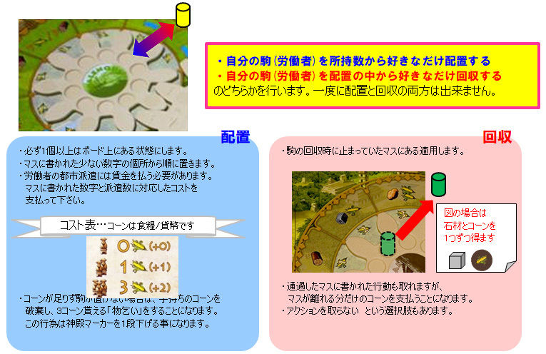手番の順序が移り変わり、ボーナス獲得、特殊能力の使用等が行えます。