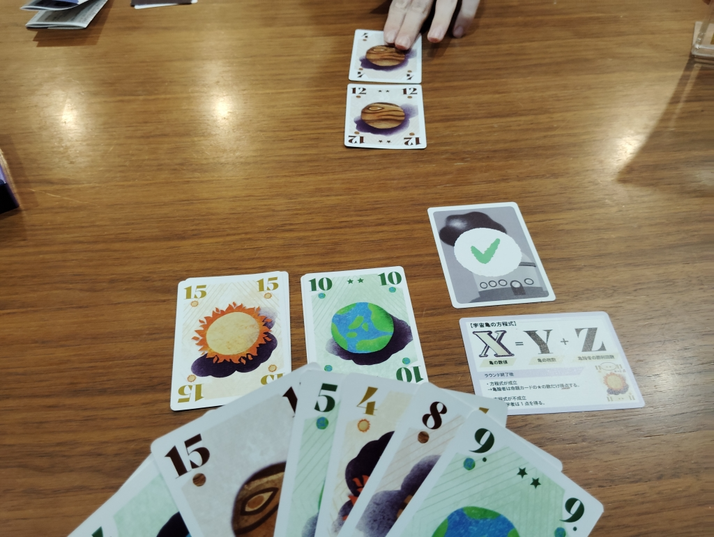 『プレイした亀カードの枚数』+『獲得したトリック数』の合計数になっていたら亀論者の意見は正しく、宇宙の正体は巨大なうちゅうかめだったことを証明でき得点を獲得します。