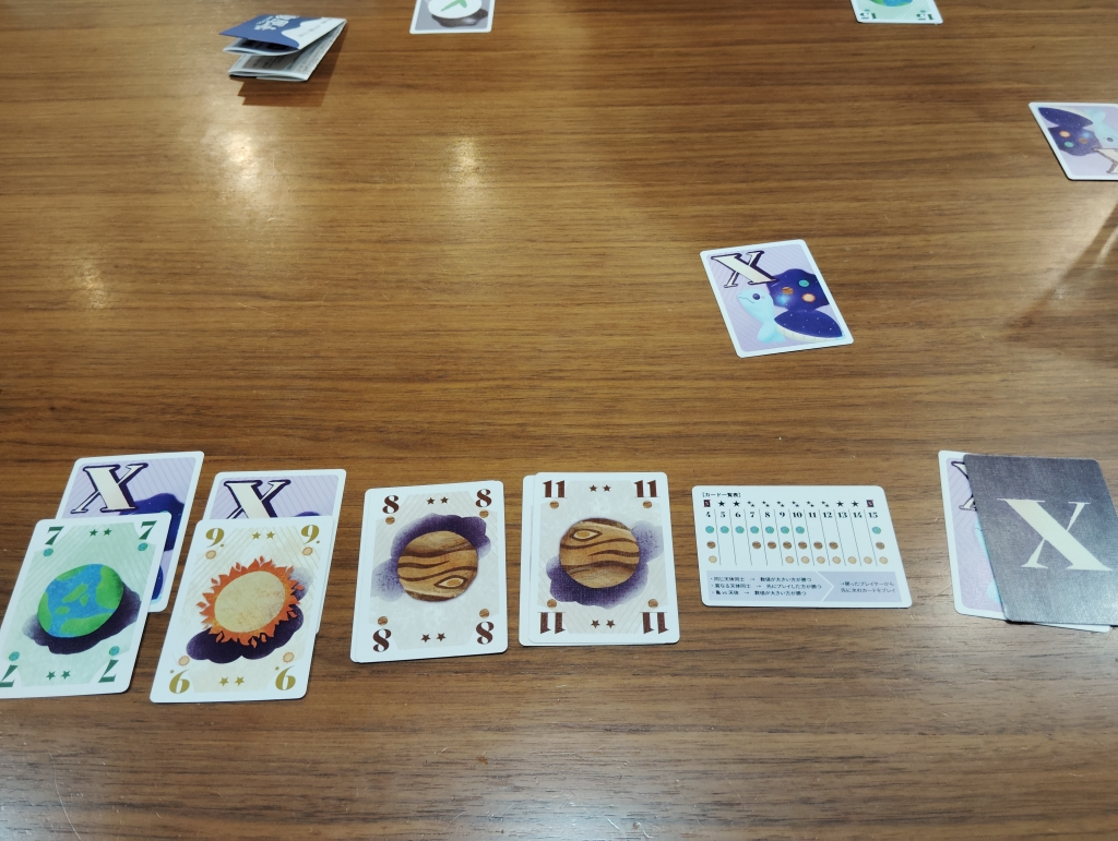 メイフォローのトリックテイキングゲームなので、好きにカードをプレイしていいですが、基本的にトリックを獲得するのは同じ天体(スート)同士で数字が大きいほうになり、リードプレイヤーがプレイした天体をプレイしなければ負けになります。