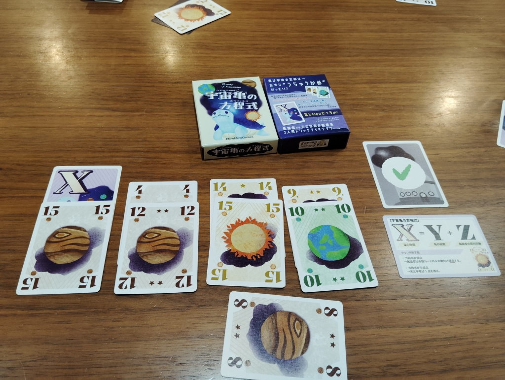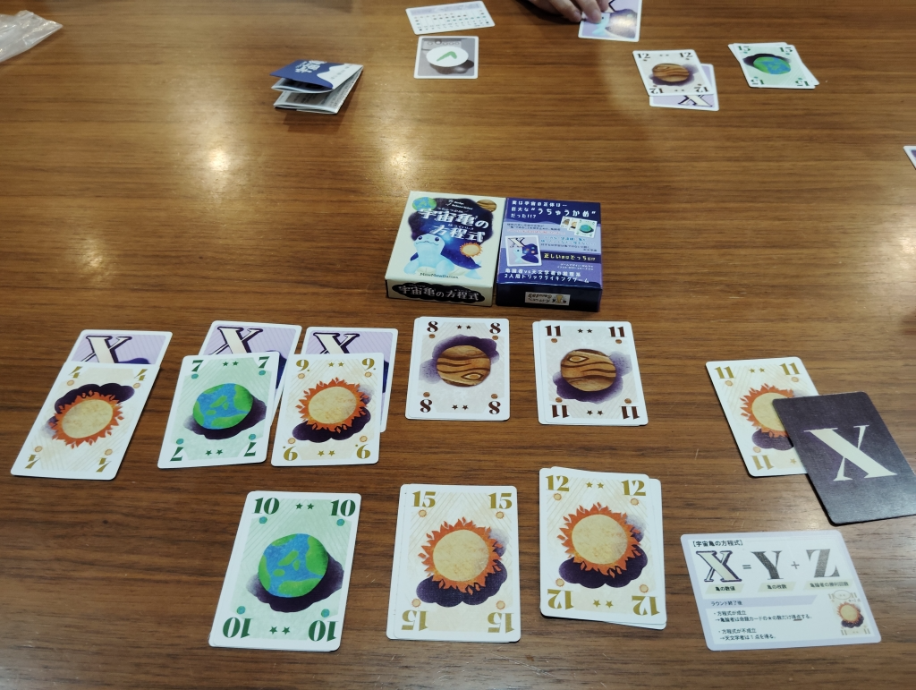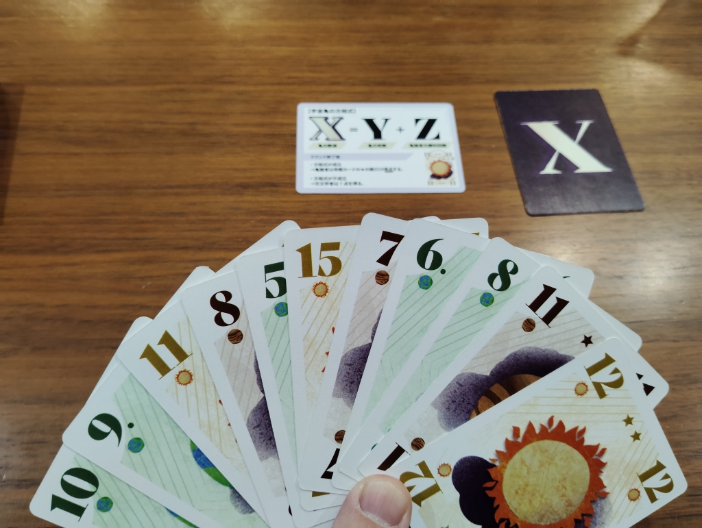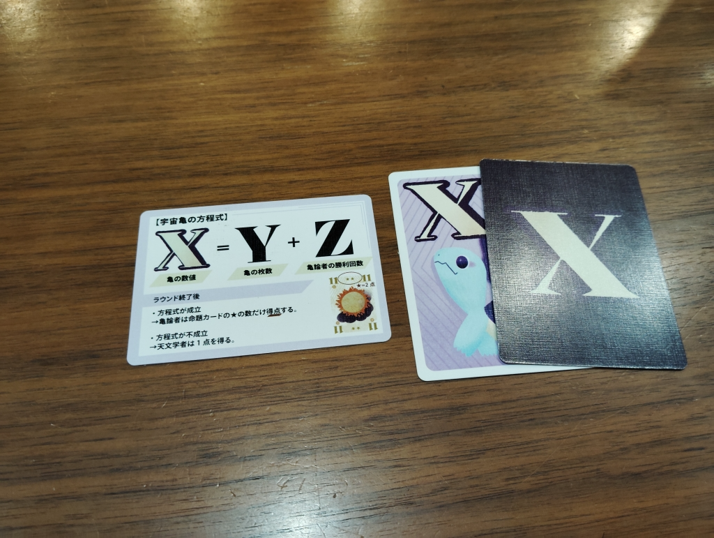 亀論者はカードを確認してから、方程式の答えのXになるカードを1枚選びXカードの下に伏せます。