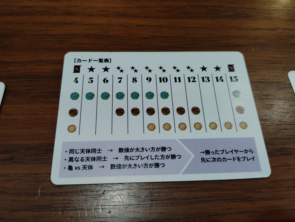 カードの裏面は亀カードになっていて、亀論者だけが裏向きにカードをプレイしてよく、すべての天体(スート)扱いになります。