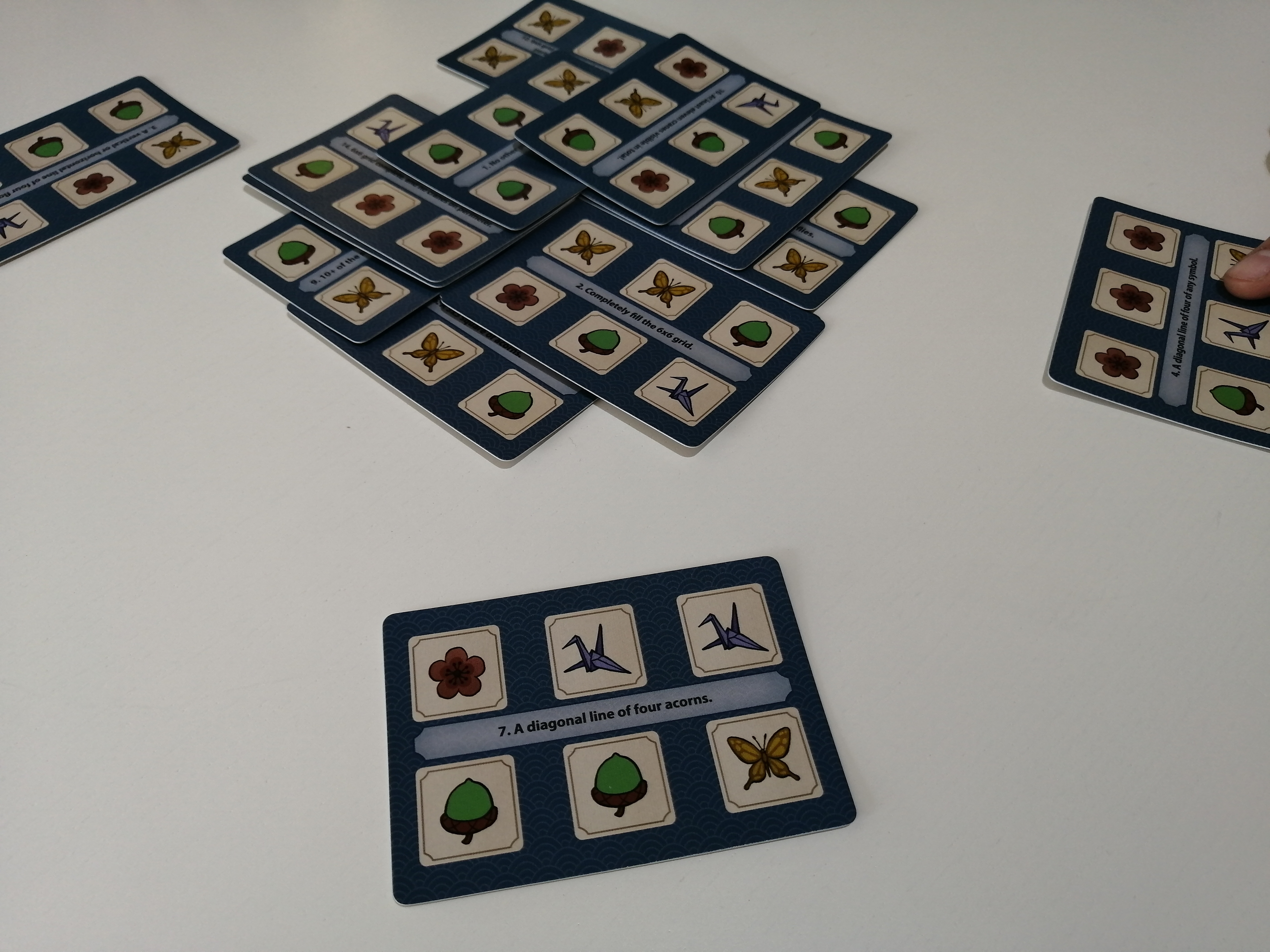 共通の場にカードを配置していくので、目まぐるしく場は変化していくので、各プレイヤーは残り手札と場を確認しながら、達成できそうなカードを残しながら手札からカードを1枚ずつ配置していく。