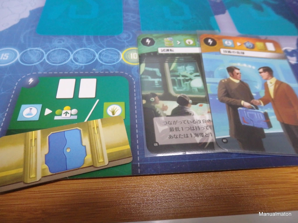 そして資源獲得や施設の建設、他のカードの使用/入手を繰り返して10ターン(3世代)が終わればゲームが終了し、条件に従って得点計算。一番高い勝利点を稼いだ人が勝利です。(ソロプレイでは7つの都市をつなぎ、100点以上稼ぐがクリア条件です)