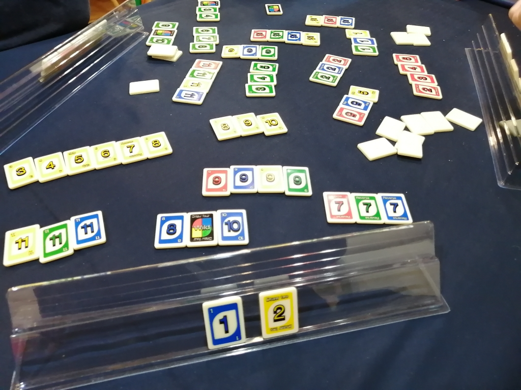手札13枚スタートはラミィキューブと同じですが、ゲーム開始時はランダムに4枚のタイルが場にありますのでそのタイルに合わせたりすることもできます。