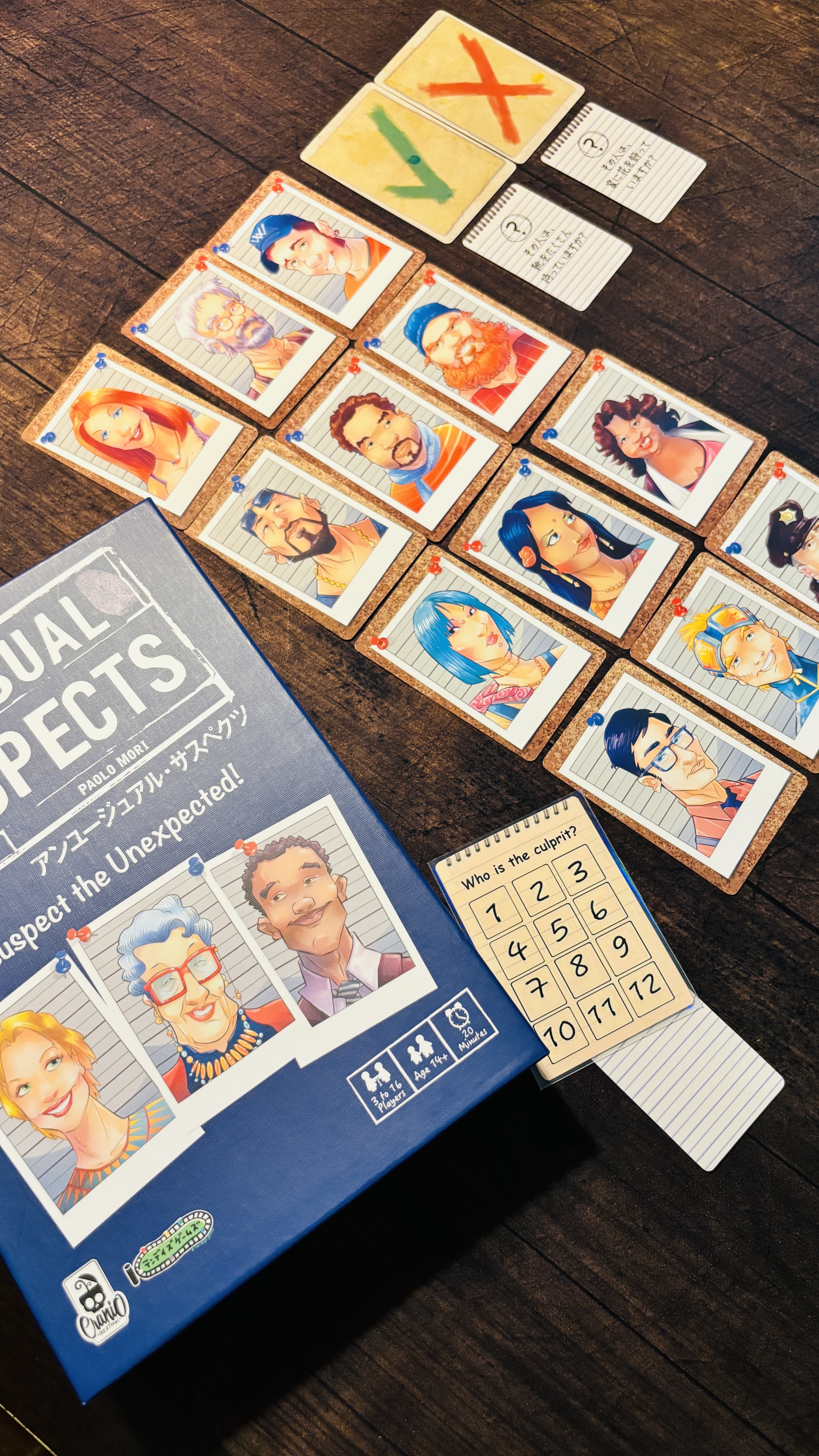 各自で12人の犯人を絞り込んでいくために、1人ずつ12マスの書き込みができるカードを配って、質問と回答をヒントにプレイヤー個々に推理していき、犯人を特定したら発表します。発表は1人1回のみで、正解なら勝利、不正解なら脱落です(発表は出来ませんが推理は続行できます)