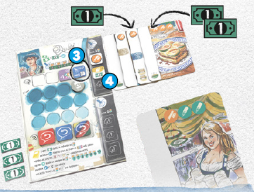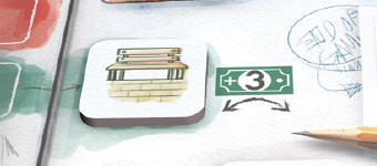 3枚目のカードでは、このスケッチブックですでに3つの割引があるため、リソースコストなしでカードCをプレイします。 同じスケッチブックで3枚のカードをプレイしたので、銀行に3金(0 + 1 + 2)を支払う必要があります。 通常であれば、プレイされたカードにはボーナスアイコンがないため、ボーナスタイルは受け取りません。ただし、あなたは、スケッチ アクションごとに少なくとも1つのボーナスタイルを付与する基本面の青の改善タイル(3)を持っています。追加のお金のタイルを選択し、それを同じスケッチブックに追加します(4)。出版するときには、その恩恵を受けることができます。 |