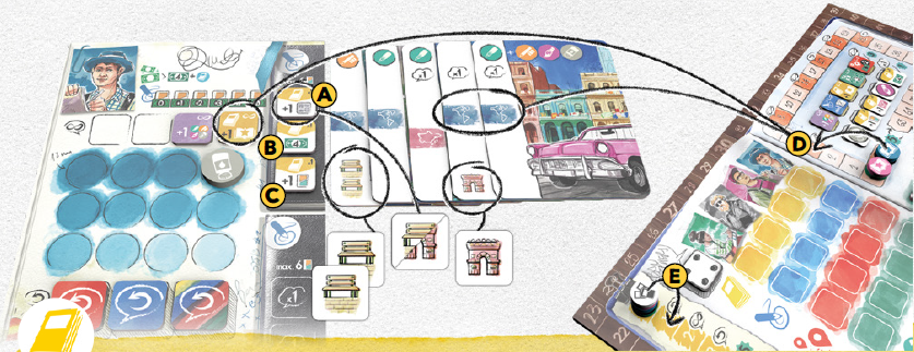 名声トラックで3スペース前進。最長の連続した地域アイコンで2、さらに基本面の黄色の改善タイルにより1スペース(D)。この前進により、改善タイル1枚を獲得します。