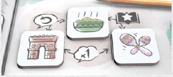 あなたは上側のスケッチブックに3枚のカードをスケッチしたいです。カードBから始めますが、バックパックに緑リソースがないため、効率性のチャンスタイル(1)を裏返してリソース2つのコストを削減します。このスケッチブックにはすでに黄リソース1つの割引が適用されているため(2)、このカードには何も支払う必要はありません。 次に、カード Aをプレイしますが、ボーナスタイルの割引(2)に加えてカードBの割引の恩恵を受けることができます。結局、黄リソース1つと赤リソース2つだけ支払うことになります。 |