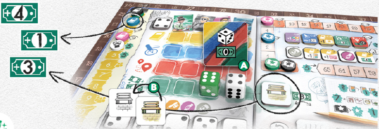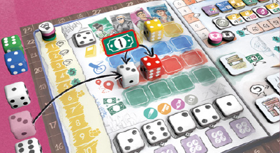 まだそのアクションを行ったプレイヤーがいない場合、または他のプレイヤーが白ダイスを使用した場合は、アクションスペースの隣にあるダイスタイルとの差の金額を銀行に支払います。