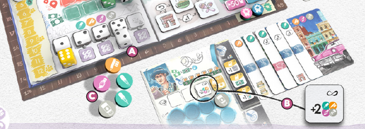 ピンクプレイヤーがすでに緑ダイスを使用しているため、あなたは白ダイスでしか緑アクションを使用できません。お金は全く残っていませんが、ありがたいことに、日和見主義のタイルはまだ準備ができています(A)。それを裏返すことで、ダイスを置いたときに2金を支払う必要がなくなります(ピンクプレイヤーは代わりに銀行から受け取ります)。