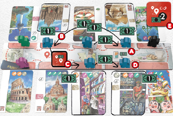 13. ファーストプレイヤーから始めて時計回りに進み、各プレイヤーはトラベルボード上の1つのスペースを選択して旅行者ミープルを配置します。同じスペースを占有できる旅行者の数に制限はありません。