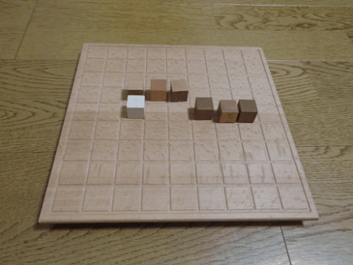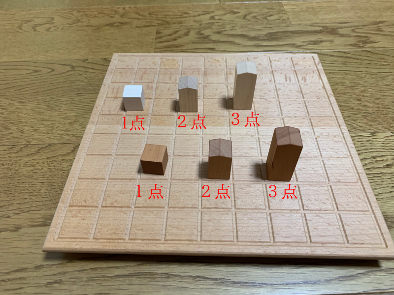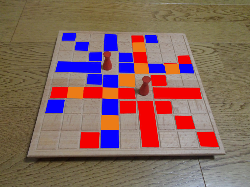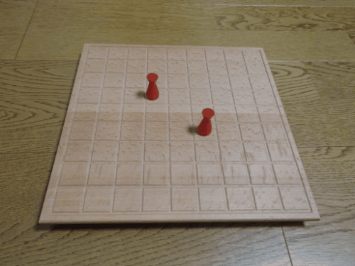 2つのポーンを動かして、互いの視線の交点に建物を一つづつ建てながらエリアを広げていきます。