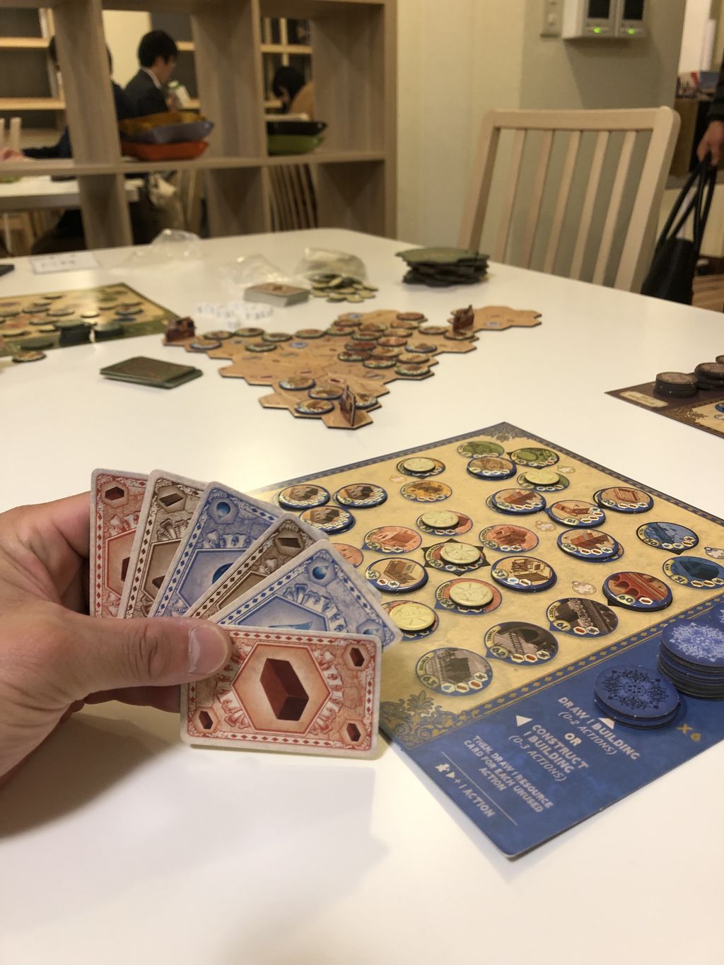自分の勝ち道だけに集中していると、他のプレイヤーに勝たれてしまうため、相手の勝ち道を塞ぎつつ自分の勝ち道を確保するという囲碁みたいなゲームだなぁと感じたゲームです。