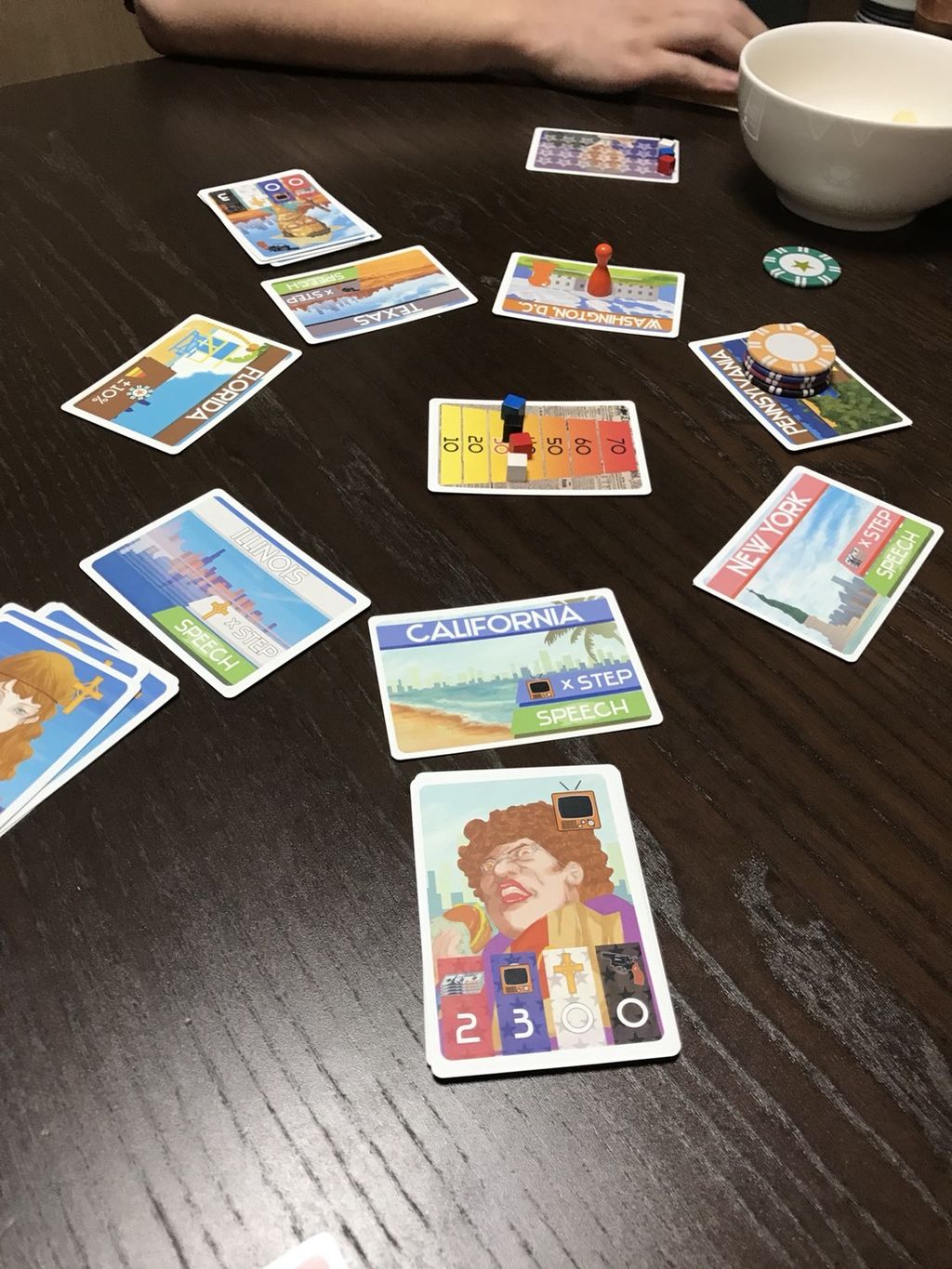 プレイ時間は短いのですが、割と上級者向きです。最初から持ってるカードと途中で取得したカードの価値の合計が勝利点になり、勝利点の高い人が勝ちなのですが、価値は全員が変動させますし残った候補者がいたらその候補者の価値があがるので、コントロールが難しく、何をすれば自分の得になるのか考えるのはけっこうたいへんでした。