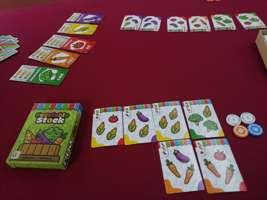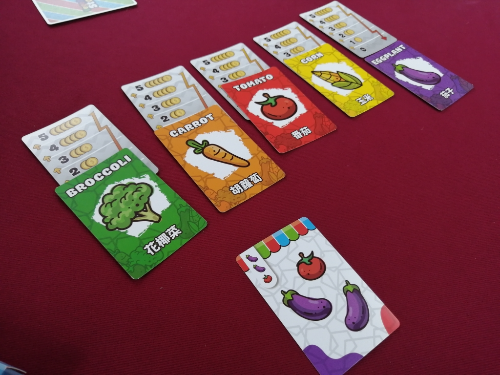 野菜の相場操作ゲームで、プレイヤー人数+1枚の野菜カードが並べられ、順番にカードを1枚ずつ選び手札に。余った1枚に描かれている野菜の数だけ、その野菜の価値が上がり5を超えると0になります。