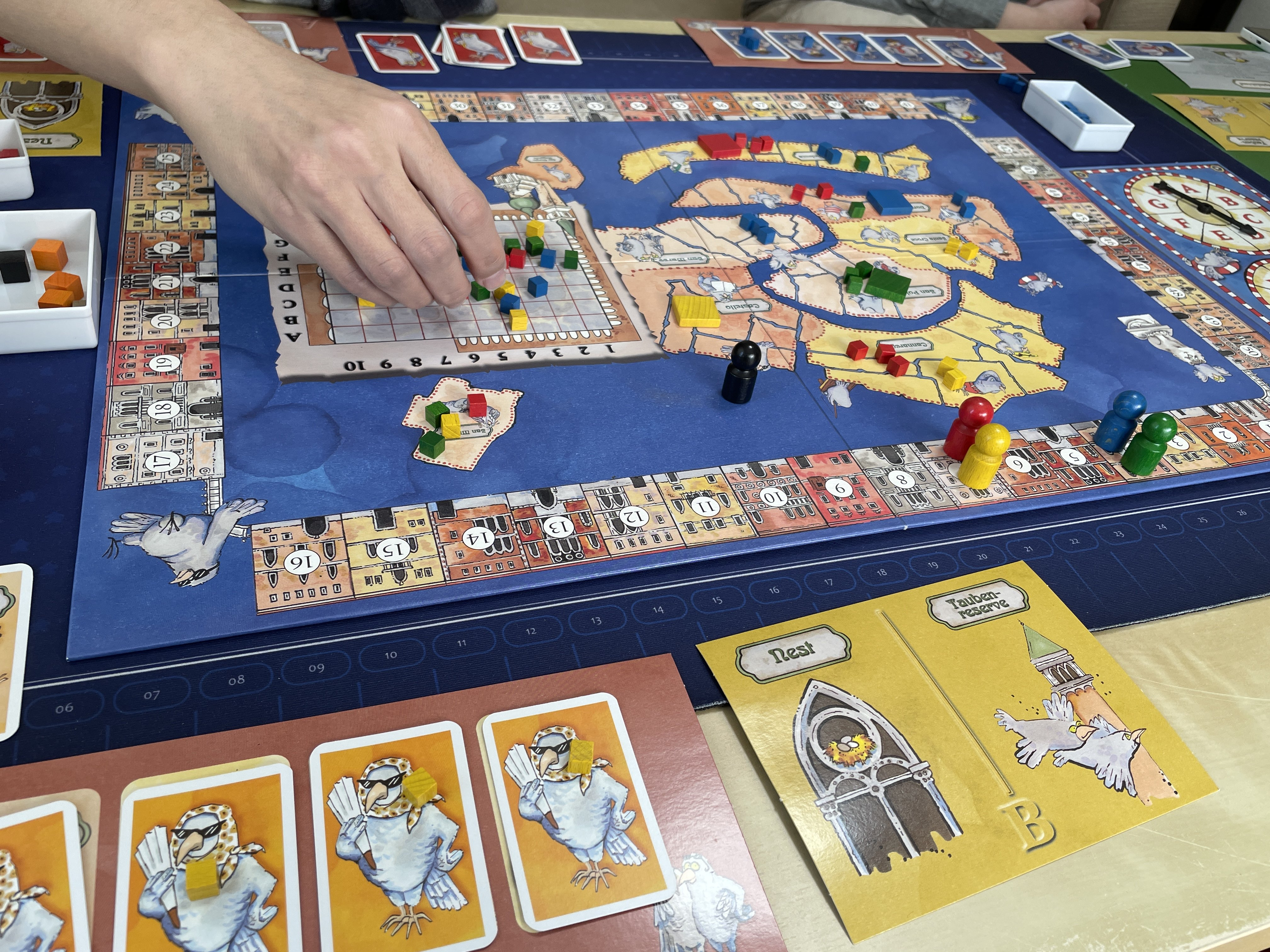 さらに、各カードの上にはキューブ(鳩)が置かれ、そのカードの場所で消費されます。