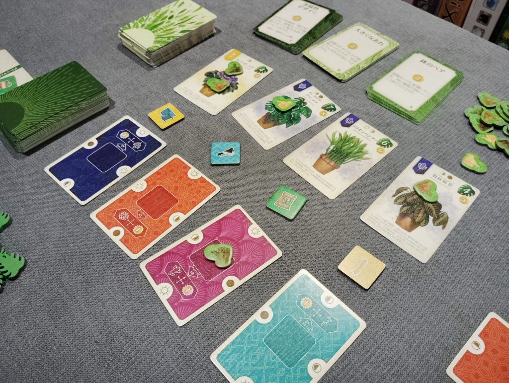 基本ルールだと得点は、成長した観葉植物得点や部屋の隣接ボーナス、早く観葉植物を成長させたボーナス、部屋のチップコレクションぐらいですが、追加ルールだと共通目標カードが3枚足されてよりゲームが楽しくなりオススメです。