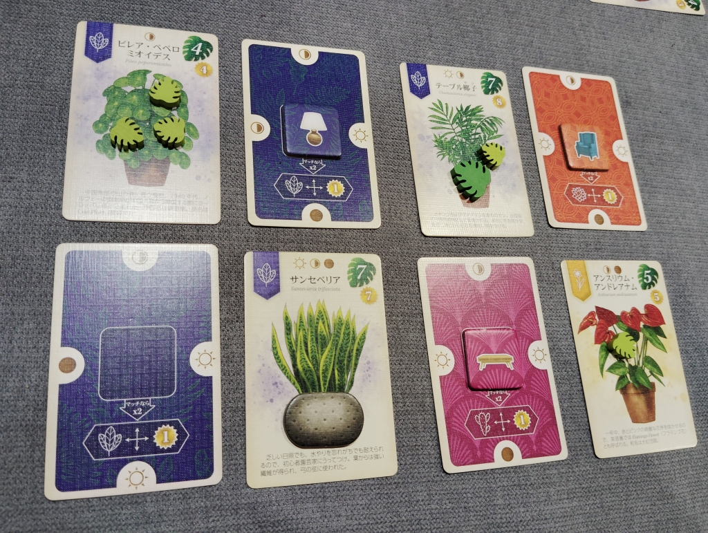 部屋と観葉植物の相性が良いとゲーム終了時に隣接ボーナスがあり、チップの色も合っていると追加ボーナスがあります。