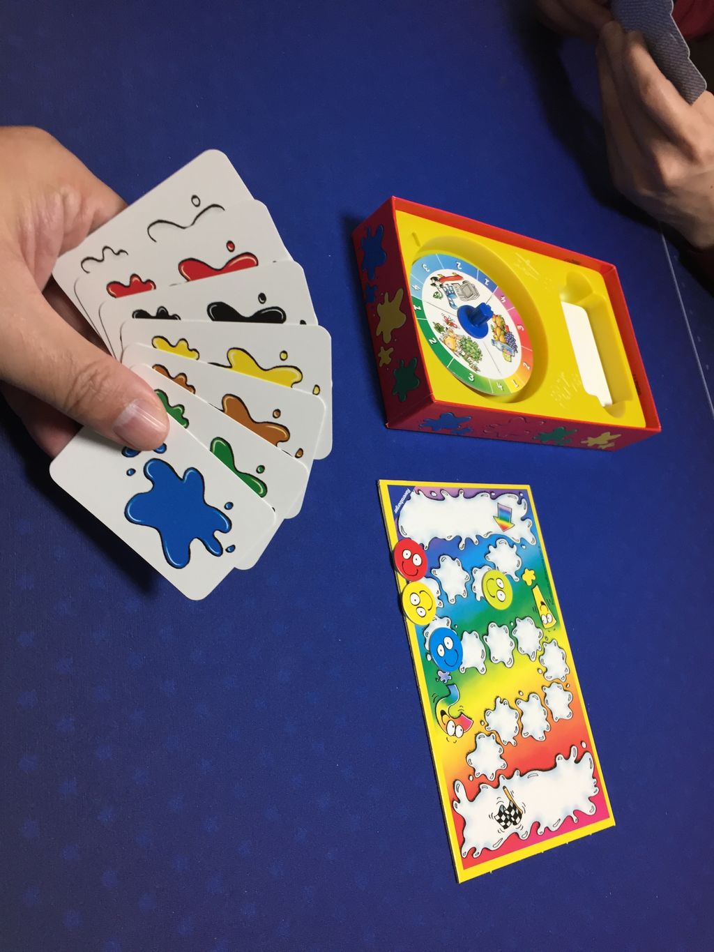 各プレイヤーに色カードのセットを配って、スコアトラックを準備したら、スタートプレイヤーはルーレットを回してお題を決めます。