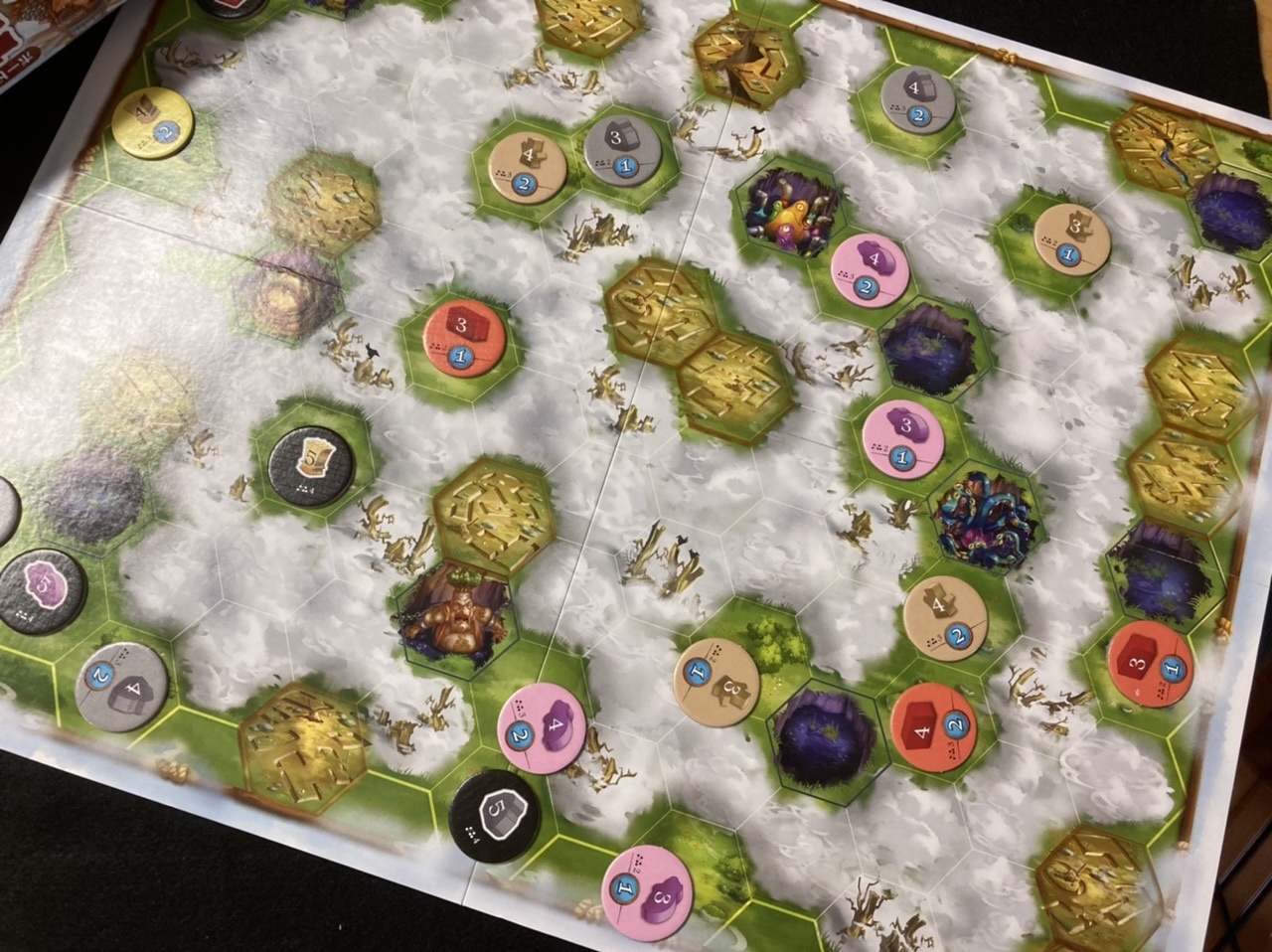露骨に相手を妨害したり、嫌がらせをしたりする要素は少ないのです。しかし、産出させた資源はみんなで共通だったり、霧を払って作った輸送ルートも互いに共有だったり、他のプレイヤーと思惑を合わせなければならない要素が多いため、「誰と協力するか」、「誰の展開に乗っかるか」、が非常に重要となります。