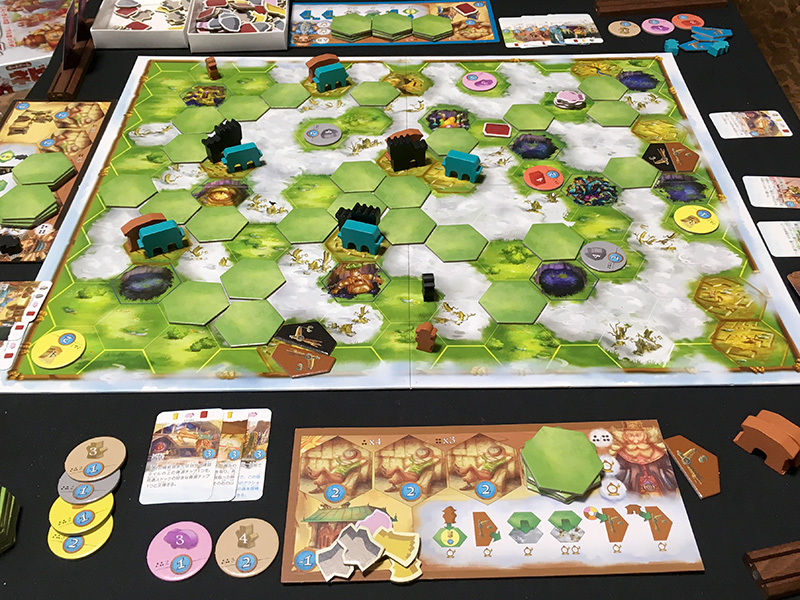 ゲーム中盤、黒のプレイヤーと一緒に下の方で資源を産んで建設していたら、青のプレイヤーがカードの効果を上手く作って一気にゲームを終わらせた。