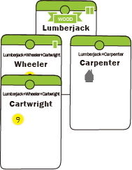 ランバージャックには2枚まで他のカードを重ねることができます。ランバージャックのカードの右上方にカードが2枚描いてあるのはその意味です。ランバージャックのカードの左下方にWheelerホイーラーを重ね,右下方にカーペンターを重ねる,のように生産チェーンを2系統に分けることができます。