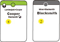 緑のCooperクーパー(樽屋)のカードには左上方に閉じた錠前のシンボルがあります。このクーパーを村に出すにはその前に錠前を解錠しなければなりません。クーパーの名前の下には黒い色でBlacksmithブラックスミスと書いてあり,開いた錠前のシンボルと小さい金2のシンボルがあります。これは黒のブラックスミス(鍛冶屋)がこの錠前を開けられることを表しています。この人を解錠村人またはアンロッカーと言います。