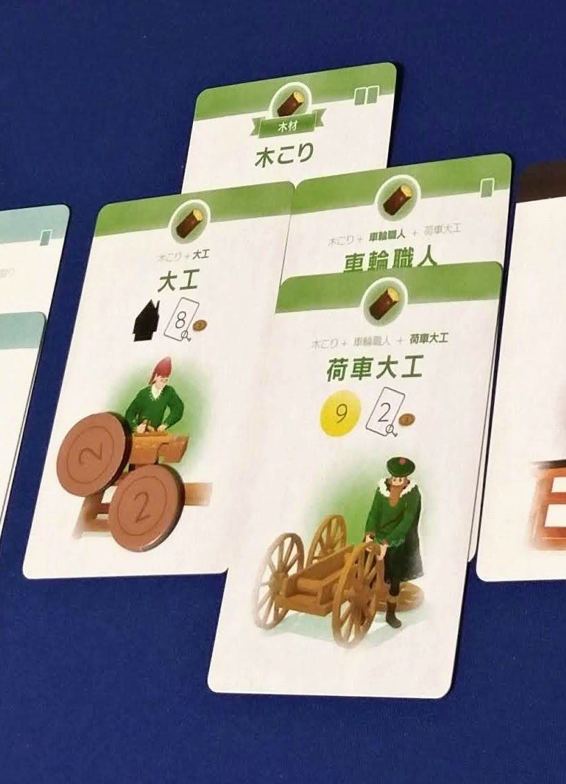 建設フェイズでは獲得したカードを配置するが、建物には前提カードの上にのみ配置できるチェーンというシステムがあり、例えば、「木こり」の上に「車輪職人」、さらにその上に「荷車大工」を配置することでボーナスや性能がアップしていく、などという仕組みになっている。