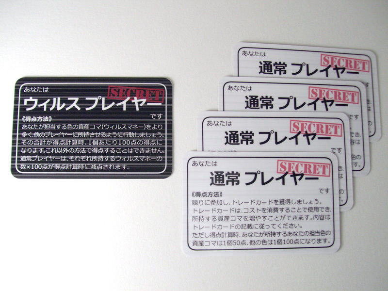 ウィルスプレイヤー:他のプレイヤーにウィルスを仕込んだ資産コマ(ウィルス・マネー)を獲得させ、最後に